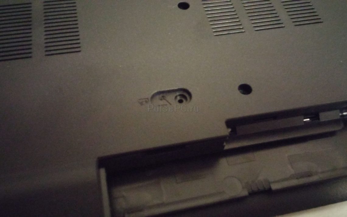 Сразу хочу отметить, что собирать этот ноутбук в разы сложнее, чем разбирать (читаем пункт 17), поэтому прежде, чем приступить, подумайте, справитесь ли Вы).0. Отключаем ноутбук от сети и вынимаем аккумулятор. Для этого вставьте отвёртку в гнездо (см. фото) и с небольшим усилием сдвиньте ползунок в сторону.