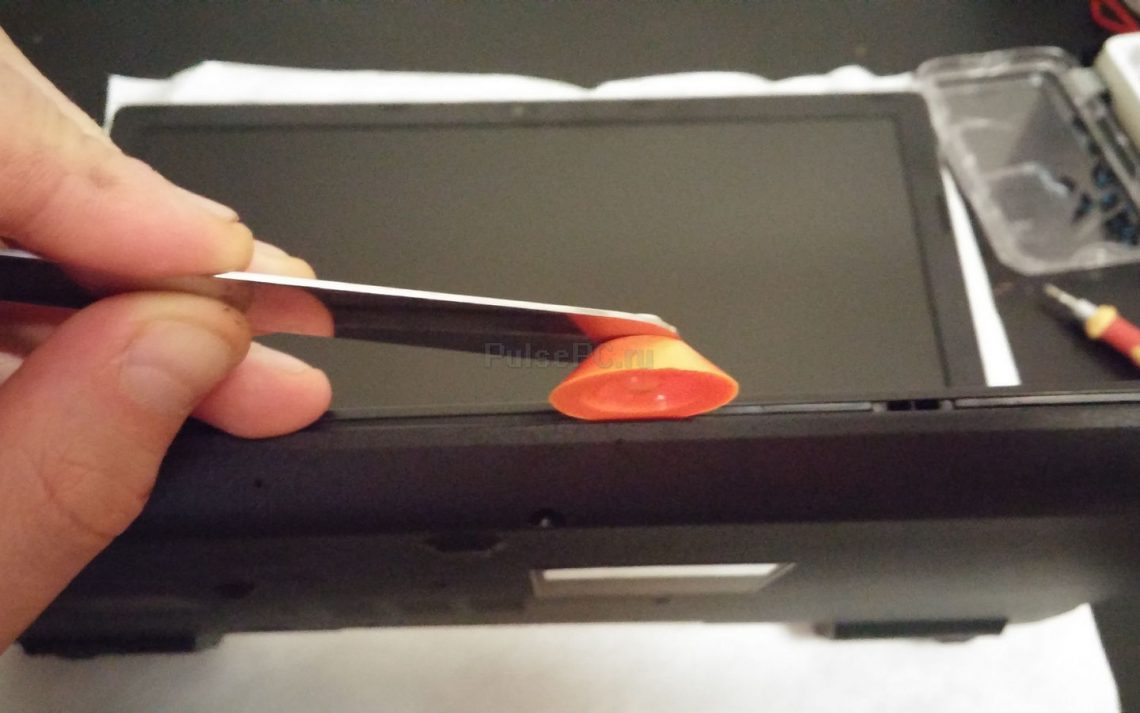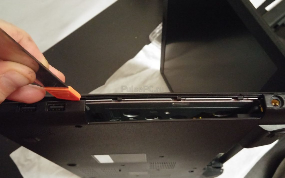 Вытягиваем руками DVD-привод. Он выходит после небольшого усилия3. Запасаемся тонким твёрдым предметом. Отлично подойдёт медиатор, ненужная пластиковая карточка или вот такое прекрасное устройство, как у меня (привет, Aliexpress!). Не рекомендую использовать отвёртки с железным наконечником, пластик ноутбука очень тонкий, можно безвозвратно повредить.Аккуратно начинаем раскреплять защёлки. Лучше начинать с места возле DVD-привода (на фото) и дальше двигаться в сторону тачпэда с шагом в 3-4 см.