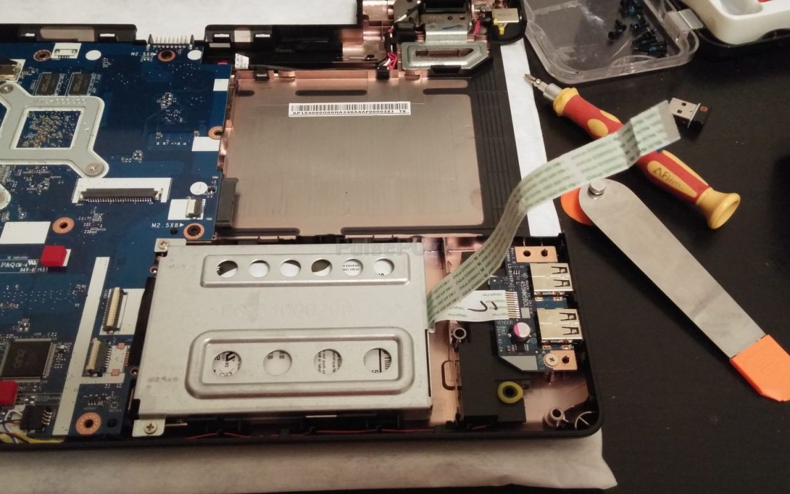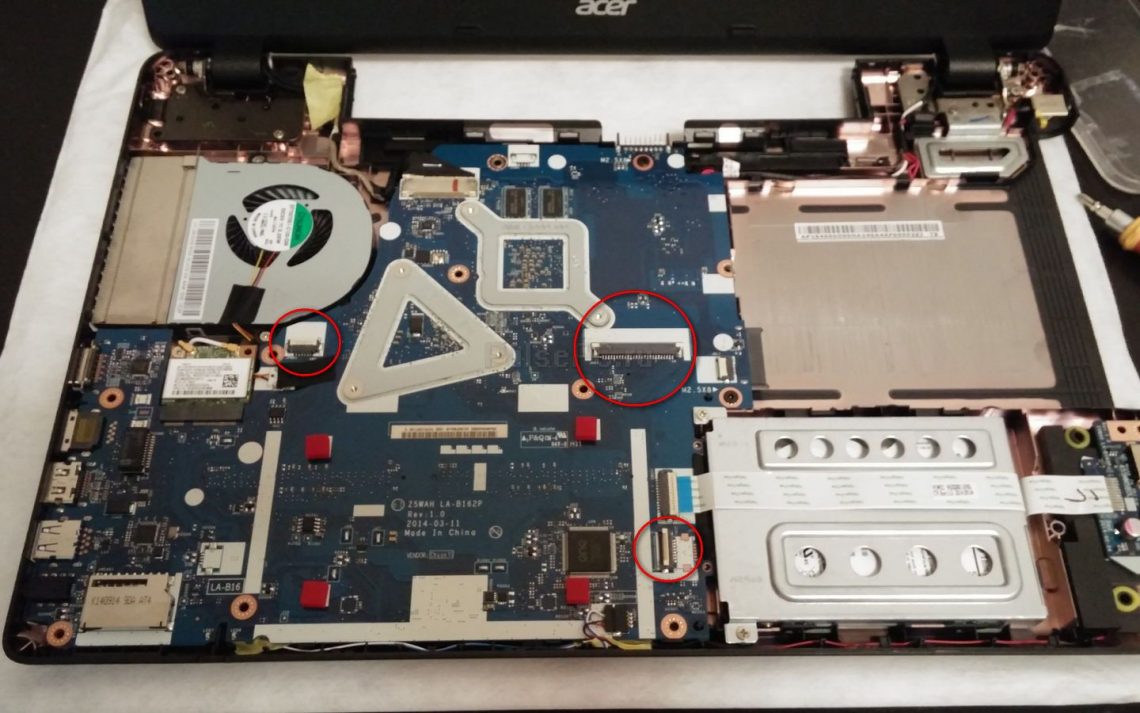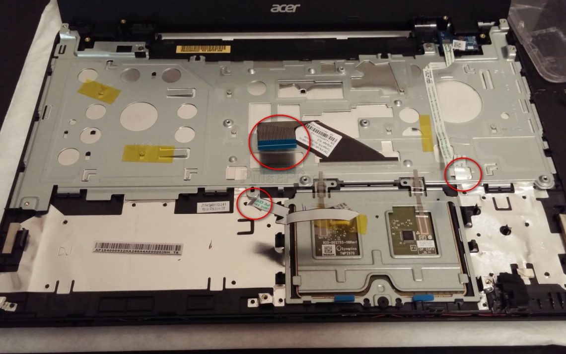 Далее Вас ждёт утомительная работа по подсоединению верхней части крышки, а точнее подключении трёх шлейфов на свои места. У меня это заняло около получаса, хотя опыт в сборке-разборке ноутбуков у меня большой. Во время подключения шлейфов я проклял всех конструкторов Acer. Выглядел я примерно так: