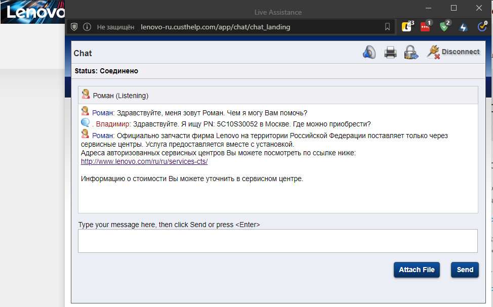 Я иду на сайт Леново, открываю тикет с поддержкой и спрашиваю, как и где я могу получить шлейф, на что получаю ответ — у авторизованных сервисных центров. Сотрудник «поддержки» кидает мне ссылку на страницу со списком СЦ, авторизованных lenovo и отключается.