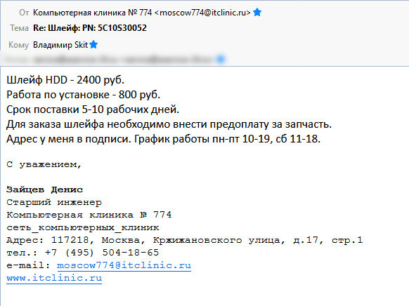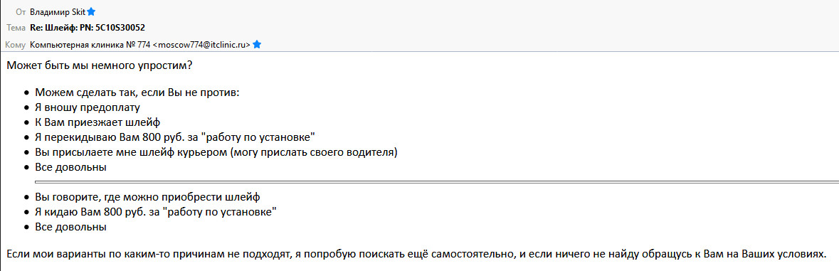 Проходит некоторое время, и мне отвечают из нескольких сервисных центров (остальные тупо игнорируют). Особенно хочу выделить один из них, который решил подзаработать на моей ситуации