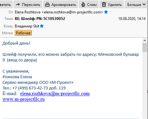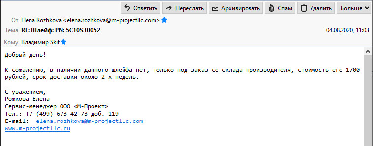 Елена Рожкова (старший менеджер М-Проект) оказывает супер-адекватным человеком, высылает мне реквизиты на оплату, я оплачиваю, она заказывает шлейф, и через две недели мне приходит электронка, что шлейф наконец-то приехал и ждёт меня у них в офисе.