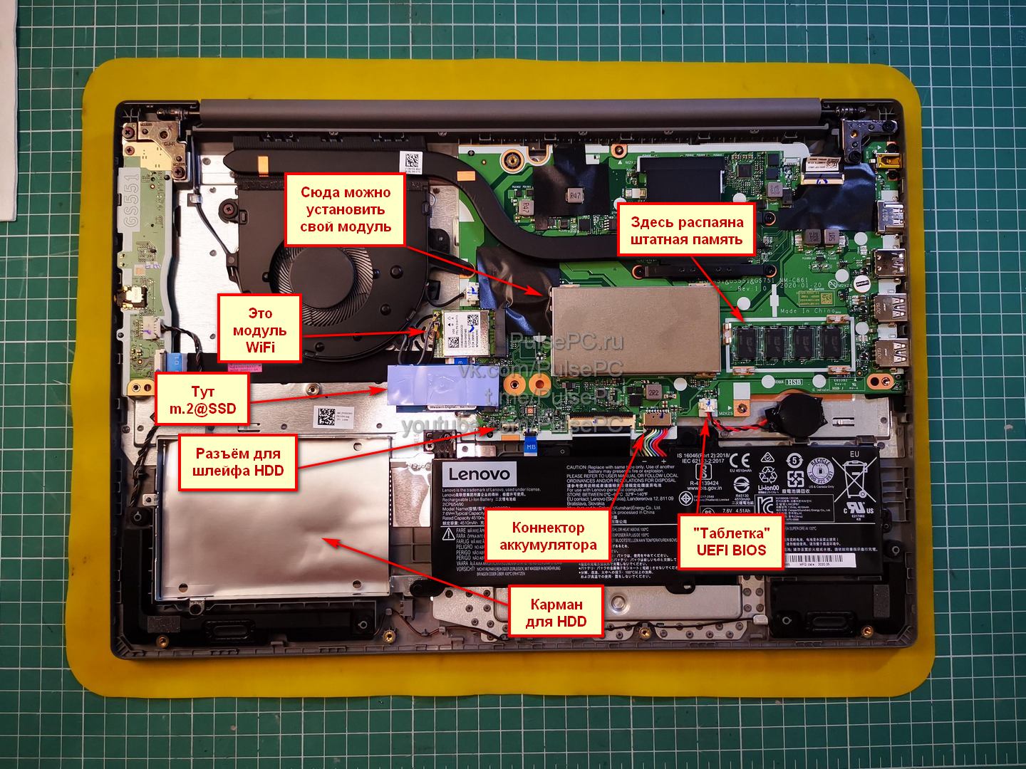 Я внимательно изучил ту информацию, касаемо модели лэптопа 81W40070RK, которая была в доступе в мировом интернете и понял, что в ноутбуке предустановлен m.2@nvme SSD форм-фактора 2242; есть корзина для установки HDD 2,5″ толщиной не более 7 мм.; отсутствует посадка под ODD, что делает невозможным установку optibay; и что есть свободный слот для модуля памяти SO-DIMM DDR-IV 2666 Mhz.