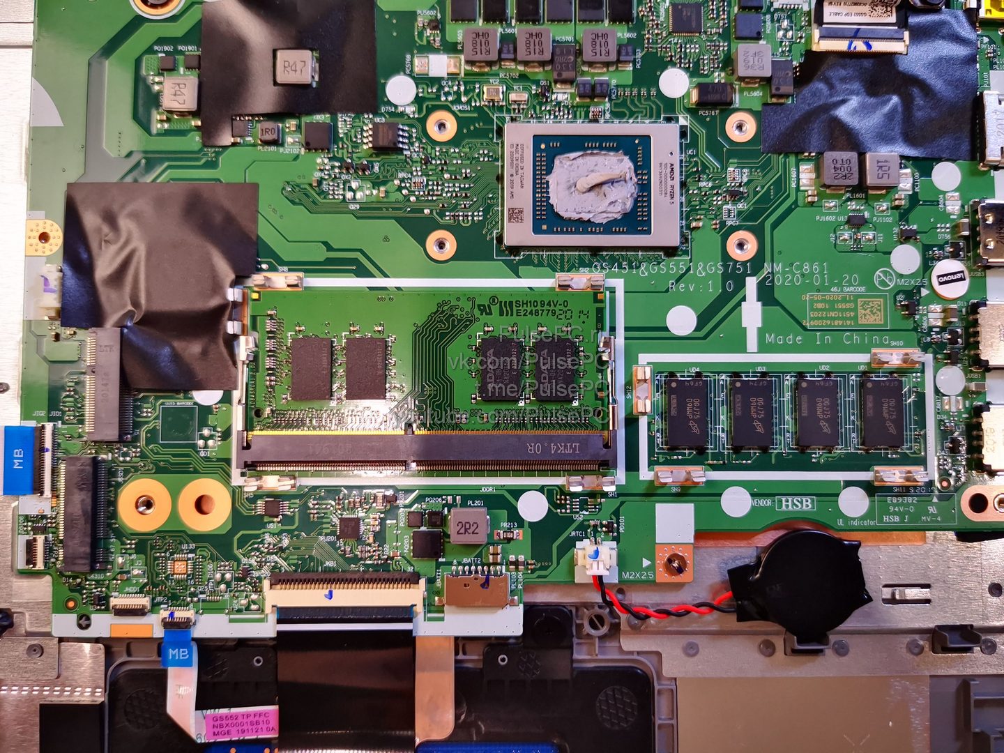 Под защитной крышкой находится пустой слот для модуля оперативной памяти SO-DIMM DDR-IV 2666@CL19. Я рекомендую покупать модули именно с такой высокой Latency, потому что изначально я приобрёл быструю память от Kingston с показателями 2666@CL16, ноутбук с ней стартовал, но почти сразу рандомно артефачил, перезагружался и выпадал в синие экраны. Я полагаю это потому что система вместо того, чтобы повысить тайминги дискретного модуля до состояния распаянного, наоборот, понижала тайминги распаянного до состояния дискретного. Надеюсь, когда Вы читаете эту статью, этот не побоюсь слова «косяк» исправили в апдейтах БИОС, но всё же не рекомендую Вам рисковать. Память 2666@CL19 (на фото ниже) у меня завелась и заработала корректно.