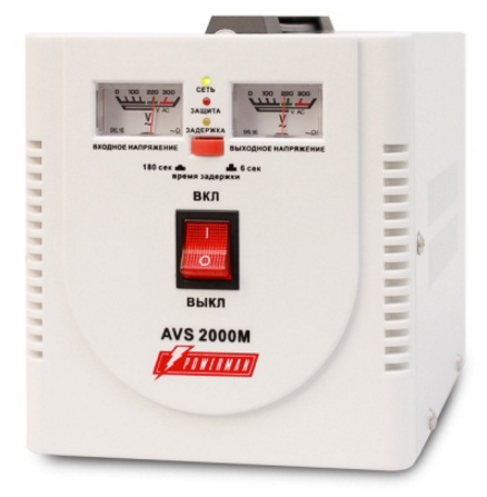 Бюджетная переносная модель однофазного релейного стабилизатора в настольном/напольном исполнении, рассчитанная на полную мощность 2000 ВА. К электрической сети подсоединяется сетевым шнуром с вилкой под розетку типа F (она же Schuko). Нагрузка подключается при помощи двух подобных розеток, расположенных на задней стенке корпуса. Индикация входного и выходного напряжения осуществляется одновременно, двумя стрелочными вольтметрами. В ассортименте производителя есть практически идентичная модель со светодиодными цифровыми индикаторами, показания которых хорошо видны даже в полной темноте. Особенностью линейки PowerMan является расширенный рабочий диапазон, что может быть востребовано в условиях крайне низких или предельно высоких входных напряжений. Если большинство других стабилизаторов отключают нагрузку при падении напряжения в сети ниже 140 В или превышении им значения в 260 В, то допустимые предельные значения у PowerMan составляют 120 и 280 Вольт соответственно. Поскольку в схеме устройства реализованы всего шесть ступеней регулировки, такое расширение происходит за счет линейного (на холостом ходу) уменьшения или увеличения выходного напряжения на границах диапазона. При этом работоспособность подключенного через стабилизатор оборудования зависит от его конструктивных особенностей.